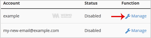 3. From the BoxTrapper Page you can see a list of your emails under the "Account" tab and the status of BoxTrapper (enabled/disabled) under "Status" tab. Click on the "Manage" Link.