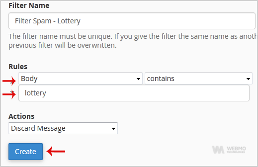 6. In the rules of the filter you can filter e-mail by many options, and should you want to deal with e-mail which contains a word like "Lottery" or other words, then select "Contains" under the "Rules" list, select "Body" from the dropdown list and from the 2nd drop down list.